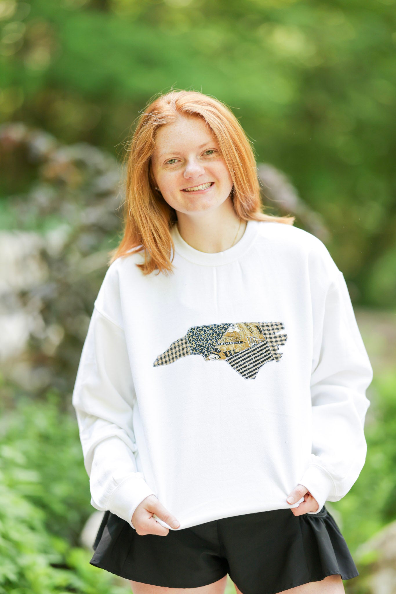 Show off your North Carolina pride with this handmade Winston-Salem patchwork crewneck, featuring the state outline filled with bold gold and black fabric pieces. This cozy and stylish sweatshirt is perfect for fans, students, or anyone who loves unique embroidered sweatshirts with a personal touch. The soft white crewneck provides a clean backdrop that makes the quilted design pop, making it ideal for fall fashion, tailgates, or everyday wear. A great gift idea for college students, alumni, or anyone who loves handcrafted, one-of-a-kind apparel.