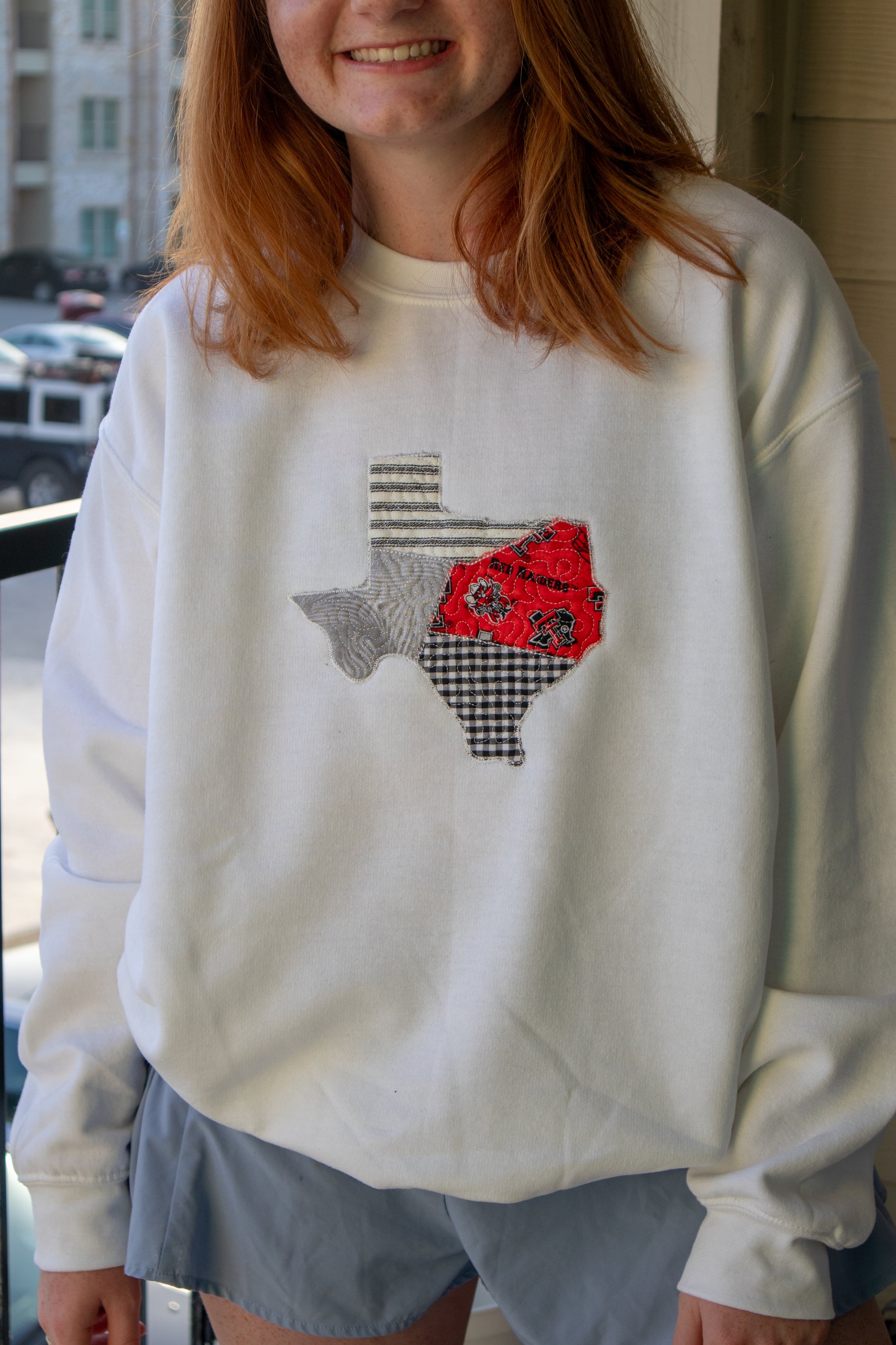 Show your Lubbock, Texas pride with this handmade quilted patchwork crewneck sweatshirt. This cozy black sweatshirt features the outline of Texas on the front, filled with a bold mix of red, black, gray, and white officially licensed fabric pieces that reflect the heart of your favorite college town. Each crewneck is carefully crafted and embroidered by hand, making every piece completely one of a kind. The use of officially licensed fabric ensures a high-quality, authentic design that proudly showcases your school spirit. Because these are handmade, fabric placement and patterns may vary slightly based on availability, giving each sweatshirt its own unique charm. Made on a soft and durable crewneck, this piece is perfect for layering, lounging, or cheering on your team in style. Whether you're a student, alum, or fan of Lubbock life, this sweatshirt is a timeless way to keep Texas pride close. Please note: each sweatshirt is made with love, and the handmade nature means every one is just a little different—adding to its special character.