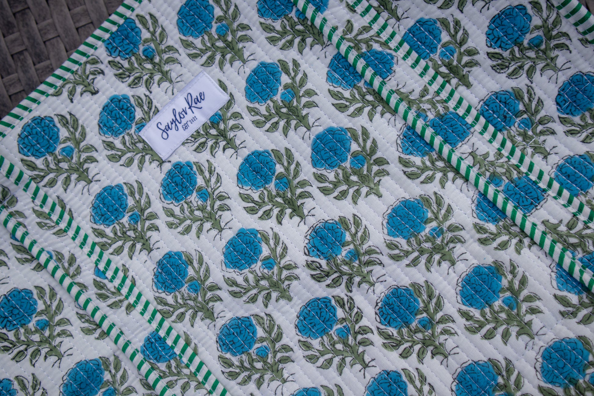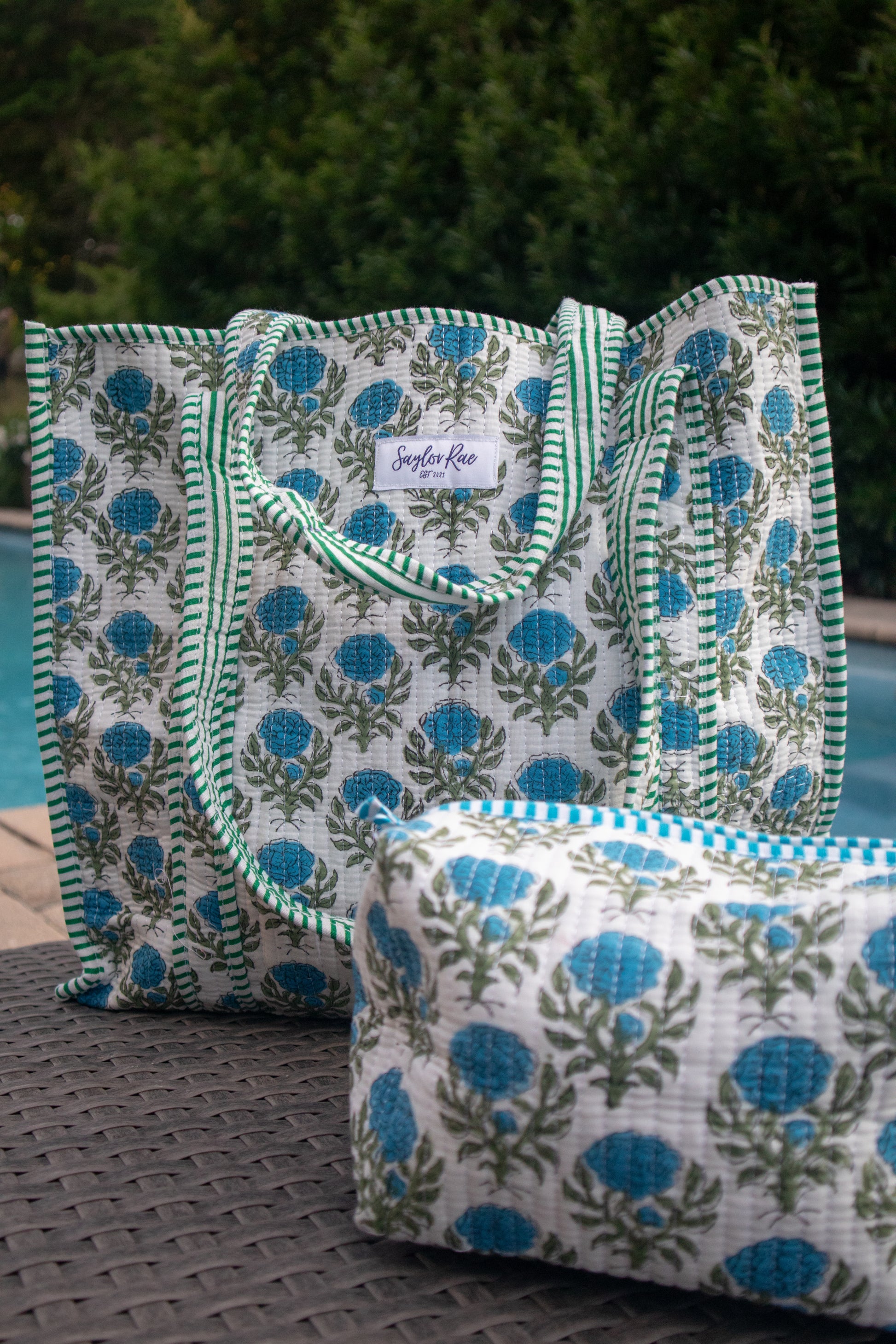 Bring a touch of coastal elegance to your everyday with this quilted tote bag, showcasing a stunning blue, white, and green hydrangea block print. Crafted from durable quilted fabric, it’s spacious enough for all your essentials and features a handy interior pocket for organization. The sturdy 13-inch handles make it perfect for beach days, market strolls, or weekend getaways. Pair it with the matching makeup bag for a coordinated and stylish look, whether you’re traveling or running errands. With its timeless floral design, this set will be your favorite go-to season after season.