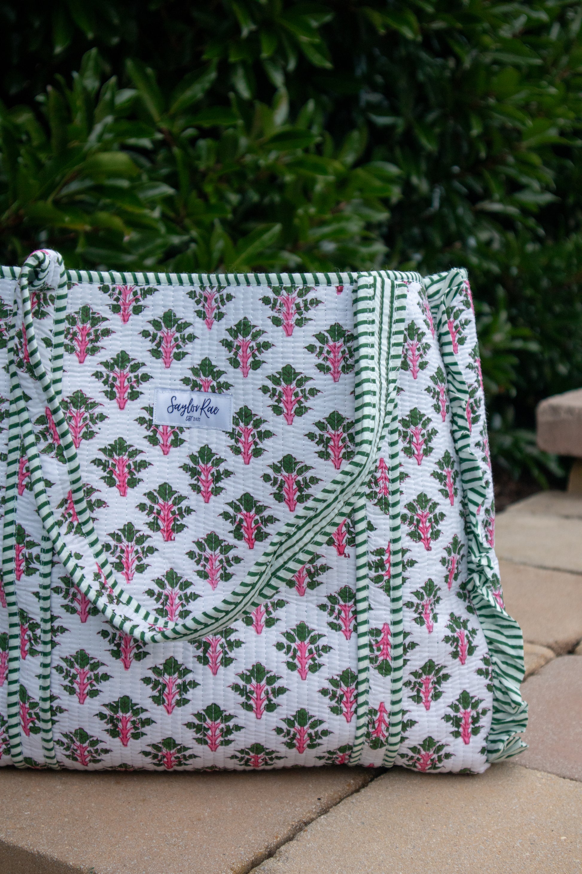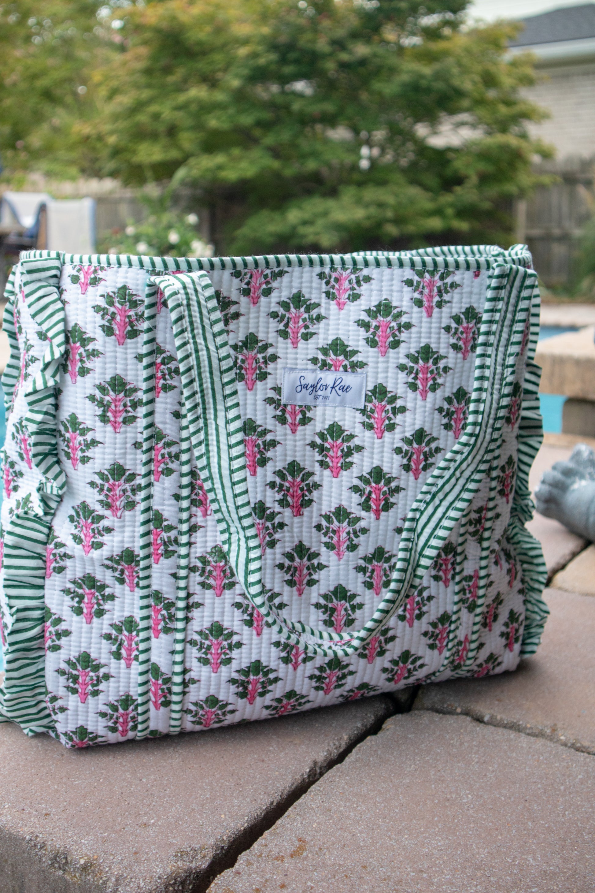 Add a touch of whimsy to your outfit with this charming ruffle tote bag featuring a crisp white background adorned with delicate pink and green floral prints. The playful ruffles add feminine flair, while the green and white striped interior brings a fresh, classic contrast. Made from durable quilted fabric, this tote offers a spacious interior perfect for all your essentials. Whether you’re running errands or heading to the beach, it’s a stylish and practical companion. Embrace timeless elegance with this beautifully crafted floral tote.