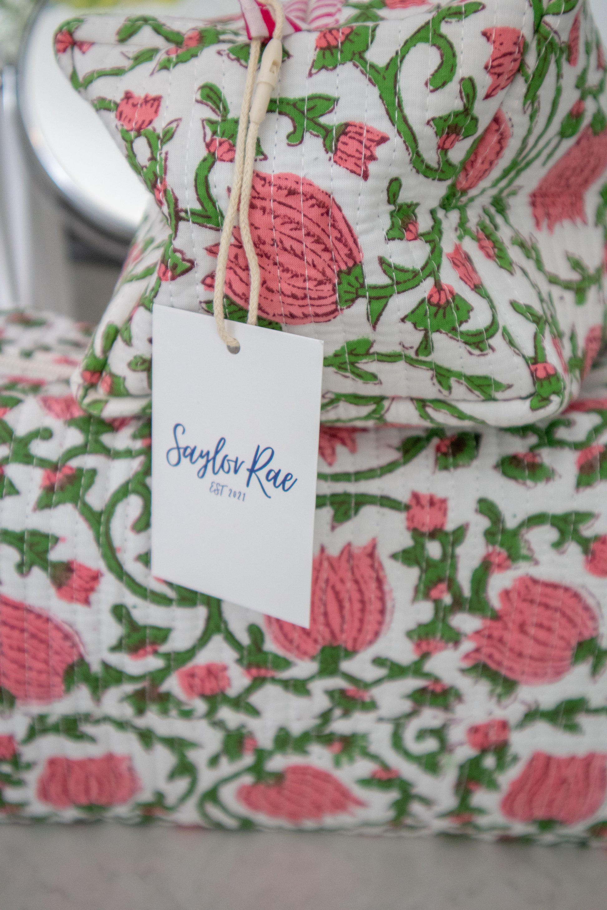 Add a romantic touch to your beauty routine with this charming 16-inch makeup and hair tools bag, featuring a rosy pink, green, and white floral design adorned with delicate vines. Spacious and stylish, it’s designed to fit full-size products, hair tools, brushes, and more — making it perfect for home organization or travel.