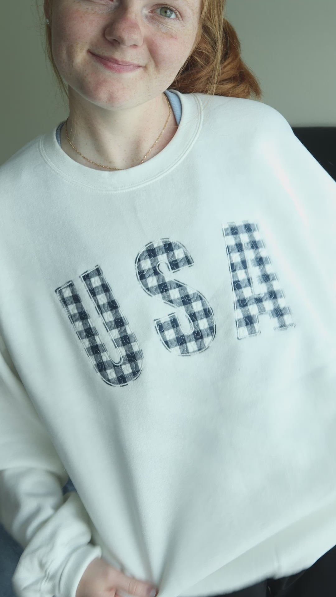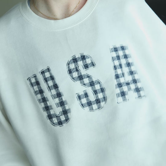 Celebrate classic Americana with our USA Quilted Crewneck, now featured on a crisp white sweatshirt for a fresh, clean look. The bold "USA" lettering is crafted from navy blue and white gingham patchwork fabric, giving it a timeless, coastal-inspired feel. With detailed quilting and embroidered accents, this crewneck combines comfort and craftsmanship. It's the perfect piece for Fourth of July celebrations, summer cookouts, or everyday patriotic pride. Handmade with care, each sweatshirt is one-of-a-kind and full of red, white, and blue spirit.